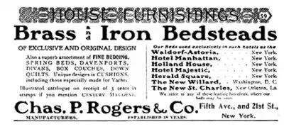Transportation: Devoted to Travel and Traffic (1900–01) "Brass and Iron Bedsteads of beautiful and exclusive design. Fine Bedding, Spring-Beds. ... Chas. P. Rogers & Co., Fifth Ave. and ..." Original from the New York Public Library v. 4–5. p. 25. Digitized April 19, 2007. Google Book Search. Retrieved November 18, 2007.