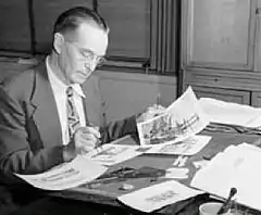 Charles Ransom Chickering (October 7, 1891 – April 29, 1970) was best known as the freelance artist who designed some 77 postage stamps for the U.S. Post Office while working at the Bureau of Engraving and Printing in Washington, DC.[2] His career as a professional artist began while working as an illustrator for the U.S. Army recording and drawing medical illustrations of the wounded and dead during the First World War.[lower-alpha 1] He continued the practice in civilian life and became a noted artist-illustrator who worked for a number of prominent magazines, including The Saturday Evening Post, which were very popular during the pre-television era of the 1920s to 1940s. After the Second World War Chickering began working for the U.S. Post office designing U.S. Postage stamps, some of which became famous. Later in life he became a designer and illustrator for first day cover cachets that were also popular among stamp and postal history collectors.[3]