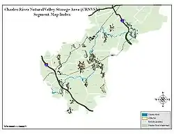 The Charles River Natural Valley Storage Area comprises over 8,000 acres (3,200 ha) of protected land in the middle and upper watershed of the Charles River in eastern Massachusetts in the United States. The lands were acquired by the United States Army Corps of Engineers and are managed by the Massachusetts Division of Fisheries and Wildlife. The project's field office is located at West Hill Dam.
