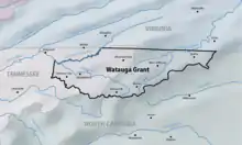 The geographical extent of the Watauga Grant corresponds to the northeasternmost portion of present-day Tennessee and the northwesternmost portion of present-day North Carolina. The boundaries were described in Old Book A, Page 1, shown below in bold, as comprising the Watauga River watershed in present-day Tennessee and North Carolina, the portion of the New River watershed that falls within present-day North Carolina, and the area in present-day Tennessee south of the South Fork of the Holston River and east of present-day Kingsport, TN.