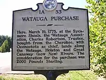 As Clerk who was appointed Trustee for the Watauga Association, Charles Robertson bought the property from the Cherokee for the sum of 2,000 British Pounds.[3] Previously, the association had leased the property including the settlements from the Cherokee. The Charles Robertson purchase from the Cherokee was mirrored a few days later by Jacob Brown for the adjacent Nolichucky Grants.