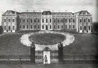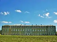 Between 1688 and 1696 the Duke rebuilt Petworth House on a palatial scale. A painting made in about 1700 of his new house was identified by the art historian Sir Anthony Blunt in the collection of the Duke of Rutland at Belvoir Castle.[7] It shows evidence of a French chateau style, with original central dome, now lost. A similar image is included in Laguerre's wall-painting on the Grand Staircase at Petworth.[8] Horace Walpole called it "in the style of the Tuileries". The parapets of the walls are surmounted by urns. On the three sections of the parapet in front of the central dome and the domed roofs of the two projecting wings are placed gesticulating statues. Today the roofline is lower and flat, giving the building a plain appearance, possibly following the fire of 1714 and subsequent repairs. The statues and urns are now lost and the entrance front has been moved to the rear.[9] One of the few elements of the old mansion he retained is the mediaeval chapel, which retains the large early 17th century Percy Window, depicting the coats of arms of several Percy Earls of Northumberland.