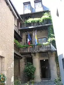 Jean-Baptiste Bernadotte was born on 26 January 1763 in Pau, the capital of the province of Béarn in the southwestern part of the Kingdom of France.[6] He was the son of Jean Henri Bernadotte (1711–1780), prosecutor at Pau, and his wife (married at Boeil, 20 February 1754) Jeanne de Saint-Jean (1728–1809), niece of the lay abbot of Sireix. The family name was originally du Poey (or de Pouey), but was changed to Bernadotte—a surname of an ancestress at the beginning of the 17th century.[7] He was the youngest of five siblings, two of whom died in childhood. Soon after his birth, Baptiste was added to his name, to distinguish him from his elder brother Jean Évangeliste. Bernadotte himself added Jules to his first names as a tribute to the French Empire under Napoleon I.[7]