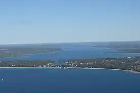 In 1864, settlers built a large dock at the mouth of the Pine River on Lake Michigan. Boats there were exposed to the harsh vicissitudes of Great Lakes weather, so local entrepreneurs sought to connect Lake Michigan to an inland harbor at Round Lake. The Pine River channel was dredged in 1869,[11] connecting Lake Michigan to Lake Charlevoix.[12][13]