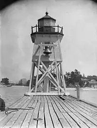 The first light in Charlevoix was located on the north pier. It was erected in 1884 in order to guide ships to the newly improved Pine River channel. A lifesaving station was built just north of the lighthouse in 1898 and an oil shed was built in 1890.[7] The first tower was 56 feet (17 m) tall,[8] with a 61 feet (19 m) focal height.[9]