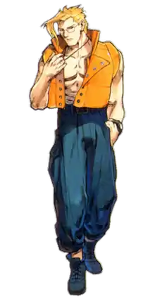 Since the Street Fighter Alpha series, Nash has been depicted as a military operative who wears green cargo pants and a yellow jacket, as well as a pair of glasses which he takes off before a fight. He has a hairstyle consisting of a large forelock of blond hair.[3] Charlie has been depicted with drastically different character designs in his appearances in licensed Street Fighter media prior to his official Alpha debut. His appearance in Street Fighter V is similar to his Alpha design, although a few very noticeable changes have been implemented. He now sports faded, green-colored skin grafts that are stapled on and cover a portion of the right side of his face, the majority of his right arm and a portion of the right side of his chest. His attire has also gained a darker coloration, with his pants now being a dark brown color and part of his vest becoming darker too. Lastly, he has gained a green gem embedded in his forehead.