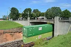 A container train on the Charlotte District passes under the King Street Overhead Bridge in Kings Mountain