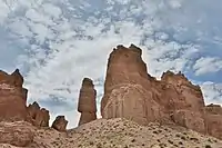 The area can be accessed from a road originating at Almaty that passes through Kokpek, Shonzy and Zharkent.[1] One of the most striking parts of the canyon is known as "Valley of Castles", for its unusual rock formations created by wind, sun, and water and vertical cliffs reminding the ancient castles.
