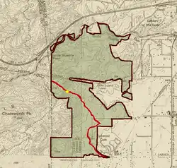 - Chatsworth Park South: includes more than 100 acres (0.40 km2) of the rocky landmark Simi Hills.[32] Chatsworth Park South is adjacent to the Santa Susana Pass State Historic Park, a 174-acre (0.70 km2) National Register of Historic Places property consisting of historic features and deposits, prehistoric village site remnants, and portions of the Old Santa Susana Stage Road, which was the main route for mail and travelers between Los Angeles and San Francisco from 1861 until the opening of rail connections between the two cities in 1876. The stage route was also declared Los Angeles Historic-Cultural Monument #92 (designated January 5, 1972) and Ventura County Historical Landmark #104 (designated October 21, 1986).[33] The park has miles of horseback, jogging, and hiking trails, picnic tables and barbecue pits, and bouldering outcrops.[34]