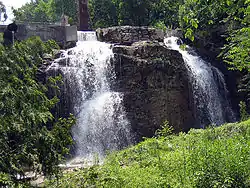 The main sawmill in the village was purchased by the Hallman family in 1944 and rebuilt after it had lain mostly idle for 22 years.[6]: 151 It burned down on October 15, 1984[16] and was still utilizing a water-driven turbine up to that point to provide one-third of its energy. The fire was likely caused by an electrical accident. A new facility was rebuilt on the outskirts of the village and started operations in March 1986.[17][18] The original sawmill was used for storage until the early 2000s when the remaining building was demolished and an inn[19] was built in its place. The area surrounding the inn features a river, a dam, a large waterfall and a forest with outcroppings of the Niagara Escarpment. The area is maintained in a picturesque condition and is considered a local tourist attraction. The waterfall is just one of many in Grey County.[20]