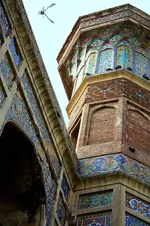 The eastern and western facades of the structure are decorated by two-storey Timurid-style iwans flanked by two levels of alcoves in a style typical of the Shah Jehan period of Mughal architecture. The building was once covered in intricate blue and green kashi kari (or Kashan-style) tile work and frescoes. The 'aiwans' are embellished with muqarnas, which were first introduced into the Mughal Empire from Persia with construction of Lahore's Wazir Khan Mosque.[2]