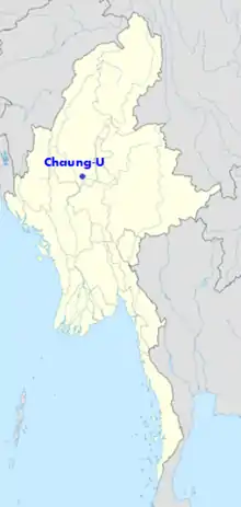 Chaung-U (Burmese: ချောင်းဦးမြို့) is a town in central Myanmar. It is located in Monywa District, Sagaing Division. It is the principal town of Chaung-U township. In the Bagan Dynasty, when King Popa Saw Rahan (also known as King Taungthugyi) governed the country, it was named "San Tauk Village". It was a large village where different natives of the Union of Myanmar, like Kayin, Shan and Lawah (Wah) natives, lived happily together.[1] Then, King Kyansit founded the city, gathering ten villages together, for example, Ywa Thit and Ywa Ma, naming it Chaung-U (or Chaung Oo). It is situated 231.46 feet (70.55 m) above sea level at north latitude 21° 57' and east longitude 95° 8' to 95° 25'. The Monywa–Mandalay highway road passes it, so the communication to it is good, quick and easy. The Monywa–Mandalay railway meets that of Chaung-U–Pakokku in the town's station, so it is possible to get there by train. Its official township boundary touches the boundaries of other townships: Myinmu is in the east, Myaung is in the south and south-east, Salingyi is in the west, and Monywa is in the north. The Chindwin River is in the west of the township and the town is six miles away from the river. In Chaung-U there are historical ancient pagodas. Besides, its township has other historical villages, streams, and hills.