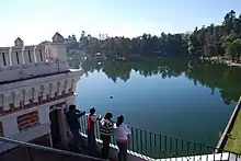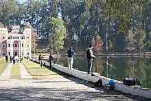 The lake is formed by a dam which was originally created by a former owner in the late 19th century.[1] It covers about twelve hectares and is divided into two sections by a land bridge that leads to what is considered to be the most iconic building on the property.[4][5] An English style residence house, locally called “El Castillo” (The Castle), was originally built as a residence hall for teachers at a planned agricultural college by the same owner who created the dam. It is a brick building with white accents. Above the door of the main portal, the date of 1898 appears, the completion date. The facade faces the land bridge dividing the lake and allows views of the entire lake.[2][4][6]