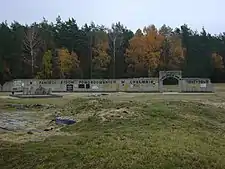 The killing center consisted of a vacated manorial estate in the village of Chełmno on the Ner river, and a large forest clearing about 4 km (2.5 mi) northwest of Chełmno, off the road to Koło town with a sizable Jewish population which had been previously ghettoized.[19] The two sites were known respectively as the Schlosslager (manor-house camp) and the Waldlager (forest camp).[20] On the grounds of the estate was a large two-story brick country house called "the palace".[21] Its rooms were adapted to use as the reception offices, including space for the victims to undress and to give up their valuables. The SS and police staff and guards were housed in other buildings in the town. The Germans had a high wooden fence built around the manor house and the grounds. The clearing in the forest camp, which contained large mass graves, was likewise fenced off. The camp consisted of separate zones: an administration section with nearby barracks and storage for plundered goods; and the more distant burial and cremation site to which victims were delivered in hermetically proofed superstructures.[16][22]