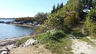 Chebeague Island is known as "Great Chebeague," as it is not always a single landmass. The nearby island of "Little Chebeague" is accessible on foot, via a sandbar that appears at low tide. Being that there are many fresh-water underground springs and rivulets, low-tide exposed sandy areas such as the sandbar, or coves, often have "quicksand" zones that must be noted with caution. Little Chebeague, approximately 3/4 of a mile long, is uninhabited and mostly dense shrub and forest. It was used during World War II as the Fire Fighters School of the Portland Naval Training Center.[14] It is now owned by the Maine Bureau of Parks and Lands as an undeveloped park where picnicking, camping and swimming are allowed, but no facilities are provided. Nearby Great Diamond Island and Little Diamond Island also share this low-tide event of having a "great" and a "small" island classification.