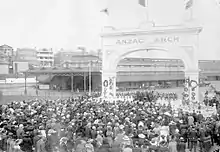Another initiative of Mrs Seager, the Arch straddled Station Road, a private thoroughfare serving the Railway Station, which passed the Cheer-up Hut before emerging at King William Road. Built at a cost of £1,000, construction of the Arch began in October 1918, and was officially opened 29 January 1919. Believed to be the first such structure erected in Australia in recognition of the Anzac forces,[24] it was demolished June 1925 after Railways Department declared it unsafe.[25] During its few years of existence many tens of thousands of servicemen passed through its portal.