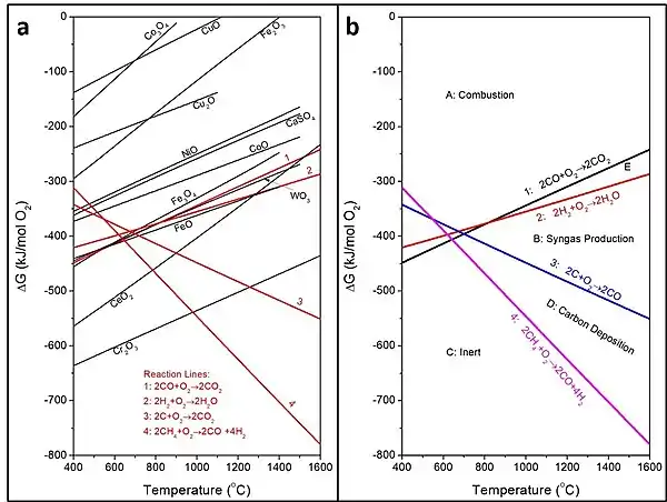 The Ellingham diagram that provides the Gibbs free energy formation of a variety of metal oxides is widely used in metallurgical processing for determining the relative reduction-oxidation potentials of metal oxides at different temperatures.[5] It depicts the thermodynamic property of a variety of metal oxides to be used as potential oxygen carrier materials. It can be modified to provide the Gibbs free energy changes for metals and metal oxides under various oxidation states so that it can be directly used for the selection of metal oxide oxygen carrier materials based on their oxidation capabilities for specific chemical looping applications.[1][3][4] The modified Ellingham diagram is given in Fig 1a. As shown in Fig 1b, the diagram can be divided into four different sections based on the following four key reactions: