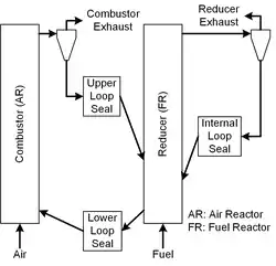 Fig 3 shows a CLR system that has been studied experimentally by Vienna University of Technology. The system consists of a fluidized bed reducer and a fluidized bed combustor, connected by loop seals and cyclones.[17] Commonly used oxygen carriers are based on NiO or Fe2O3. The NiO-based oxygen carriers exhibit excellent reactivity, as shown by the high conversion of natural gas. The Fe2O3-based oxygen carriers have a lower material cost while their reactivity is lower than that of the NiO-based ones. Operating variables such as temperature, pressure, type of metal oxide, and molar ratio of metal oxide to gaseous fuel will influence the fuel conversion and product compositions. However, with the effects of the back mixing and distributed residence time for the metal oxide particles in the fluidized bed, the oxidation state of the metal oxide particles in the fluidized bed varies that prevents a high purity of the syngas to be produced from the reactor.