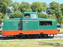 In 1930, the VFIL abolished third class.[28] Third class carriages were reclassified as second class.[30] In 1931, an 0-6-0+0-6-0T Mallet locomotive was bought. It was restricted to operating between Anvin and Guînes.[29] In 1932, VFIL built a railcar at Lumbres. It was fitted with a 65 horsepower (48 kW) De Dion JMH petrol engine. Numbered ARB2, it seated 28 with twelve standing. Another railcar, numbered CGL1 was built at about this time. In 1933 railcars RS1 and RS2 were rebuilt at Lumbres. RS1 was shortened and fitted with at 65 horsepower (48 kW) Unic diesel engine. It was renumbered CGL11. RS2 was fitted with an 85 horsepower (63 kW) Berliot diesel engine. It was renumbered PdC101. In 1934-35, five more railcars were built at Lumbres. These were fitted with 65 horsepower (48 kW) Unic M24 diesel engines. Numbered ARB3-5 and CGL6-7, they seated 29 with eleven standing.[31] All railcars were second class only.[28]