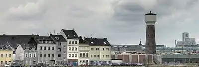On 24 May 1892 the Vorster & Grüneberg Kommanditgesellschaft was renamed into Chemische Fabrik Kalk GmbH (CFK) and converted into a company with limited liability (GmbH).[14] It was one of the first limited liabilities companies in the German Empire as the law on companies with limited liabilities was adopted only one month earlier. On 7 June 1894 the last surviving founder Hermann Julius Grüneberg dies. His son Richard Grüneberg succeeds him and joins the management board of the company.[7] After 1900 the production of potassium carbonate ceased due to competitive pressure. Instead, the company began to produce sodium carbonate using the Solvay process. In 1902 the Düngerfabrik C. Scheibler & Co. was incorporated, and a year later the last remaining factory in the Staßburg region, the potassium chloride factory in Leopolshall was sold. To guarantee the water supply in the main factory in Kalk a water tower with an integrated chimney and a height of 43.6 metres (143 ft) was built. This water tower should dominate the skyline of Kalk for the next one hundred years.[15]