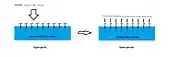 A common method to increase adhesion of photoresist on the silicon wafer surface is to treat the wafer with Hexamethyldisilazane (HMDS). A new silicon wafer has a polar surface and has some adsorbed water on the surface.[10] The wafer can undergo a dehydration bake to remove adsorbed water, and followed by the HMDS treatment also known as the priming stage. HMDS can be dispensed in liquid form onto the wafer using a syringe while the wafer is attached to a vacuum chuck in a spin coater. HMDS can also be applied in gas form in the process known as the vapor prime. The HMDS promotes good photoresist-to-wafer adhesion because it ensures the wafer surface is hydrophobic. After HMDS treatment the silicon surface oxide becomes silated, leaving a non-polar surface.[11] The pristine silicon (100) face has a surface energy value of 56.9 mN/m, which is reduced to a value of 44.1 mN/m after HMDS treatment[12] The molecular formula for hexamethyldisilazane is C6H19NSi2.