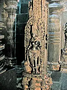 The navaranga hall has forty eight pillars. All except the central four are carved in a unique way. The central four are later additions, added in 1381 CE during the Vijayanagara Empire era, to support the internal structure of a damaged temple.[47] The pillars are of three sizes. Two pillars are particularly notable. One is the so-called Narasimha pillar which is carved with miniature figures from top to bottom, such as a tiny bull (kadale basava).[47] The local legend states that this pillar once could rotate because of how it was supported, but it no longer can be rotated.[47] The other pillar is the Mohini pillar.[50] Other than the female avatar of Vishnu, the pillar has eight bands of carvings, including those of Brahma, Vishnu, Shiva, then ten avatars of Vishnu, the eight direction deities, mythical animals with the body of a lion but the face of other wildlife.[47] The four central pillars are notable for having been hand carved while the others were lathe turned.[51]