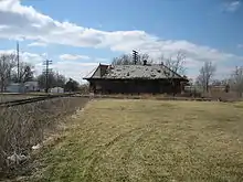 Slowly, additional improvements were made. Rectangular blocks of stone were placed at road intersections. Changes in livestock laws made it possible for residents to tear down the wooden fences that had once surrounded every residence. Many trees were planted. The Chicago and Alton was double tracked in 1890. In 1891 the first electric lights were installed. A union station was built so both railroads could share passenger facilities; unfortunately it burned down during Armistice celebrations on November 11, 1918.[21] This was not the towns only serious July 1894 the entire business district town east of the Railroad burned down; very few of the buildings were insured.[22] Railroad traffic peaked in 1911, when twenty-four trains arrived.[23] After that automobile and truck traffic slowly replaced trains and Chenoa became a stop of the fabled Route 66. Chenoa was once home to two competing grain elevators. The last one was demolished in late December 2020.