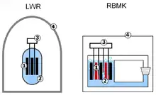 In power-generating operation, most of the heat generated in a nuclear reactor by its fuel rods is derived from nuclear fission, but a significant fraction (over 6%) is derived from the radioactive decay of the accumulated fission products; a process known as decay heat. This decay heat continues for some time after the fission chain reaction has been stopped, such as following a reactor shutdown, either emergency or planned, and continued pumped circulation of coolant is essential to prevent core overheating, or in the worst case, core meltdown.[20] The RBMK reactors like those at Chernobyl use water as a coolant, circulated by electrically driven pumps.[21][22] The coolant flow rate is considerable - Reactor No. 4 had 1661 individual fuel channels, each requiring a coolant flow of 28 m³/hr at full reactor power, for a total of over 45 million litres per hour (12 million gallons per hour) for the entire reactor.[23]
