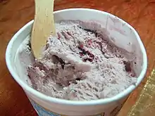 Cherry ice cream is a common ice cream flavor in the United States consisting of typical ice cream ingredients and cherries.[1][2][3] Whole or sliced or chopped cherries are used, and cherry juice or cherry juice concentrate is sometimes used as an ingredient.[3][4] Cherry extract and cherry pit oil have also been used as ingredients.[5][6] Various cherry cultivars are used, such as black cherries, bing cherries and sour cherry cultivars.[7][8][5] Maraschino cherries are also used.[5] Cherry gelato has also been produced, and the dish can be prepared as a soft serve ice cream.[9][10] Chocolate is sometimes used as an ingredient in cherry ice cream.[11]