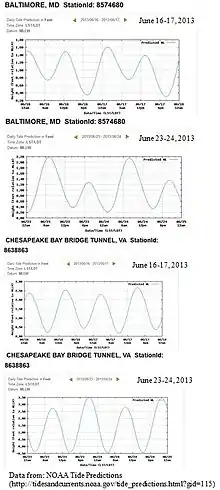 A good example of how the different Chesapeake Bay sites experience different tides can be seen in the tidal predictions published by the National Oceanographic and Atmospheric Administration (NOAA) (see figure at right).