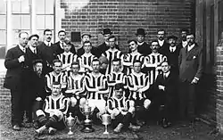 The original Cheshunt Football Club was formed around 1880 and played in black and white stripes.[2] The first recorded game was in 1888, winning 4–0 against Novocastrians. They won the first Herts Charity Cup in 1900–01, and went on to win it again in 1903–04 and 1905–06. They also reached the FA Amateur Cup semi-final in 1903–04, losing 2–0 to Ealing.[3]