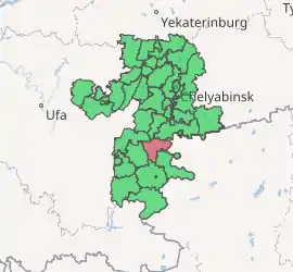Chesmensky District (Russian: Чесменский райо́н) is an administrative and municipal district (raion), one of the twenty-seven in Chelyabinsk Oblast, Russia.[1] It is located in the southeast of the oblast. The area of the district is 2,663 square kilometers (1,028 sq mi). Its administrative center is the rural locality (a selo) of Chesma.[1] Population: 20,185 (2010 Census);[2] 20,459 (2002 Census);[5] 19,638 (1989 Census).[6] The population of Chesma accounts for 32.3% of the district's total population.[2]