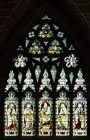 The quire is entered through a screen designed by George Gilbert Scott, with gates made by Skidmore. The rood was designed by Scott, and was made by F. Stuflesser.[4] The bishop's throne or "cathedra" was designed by Scott to complement the choir stalls. It was constructed by Farmer and Brindley in 1876. The reredos and the floor mosaic date from 1876, and were designed by J. R. Clayton. The east window has tracery of an elegant Decorated Gothic design which is filled with stained glass of 1884 by Heaton, Butler and Bayne.[43]