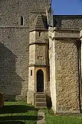 Manor Farm House is in Manor Farm Lane. The oldest part of the building is a 12th-century barrel-vaulted undercroft, now incorporated into an annexe of the building. A partly-blocked arched doorway and deeply-splayed window survive. The undercroft has very thick walls and is about 12m by 4.4m internally.[6] Some remains of the upper storey survived but were demolished when a music room was built, as the significance of the building was not then recognised. The rest of the house is largely 16th- or 17th-century and was remodelled in the 18th century. It is a Grade II* listed building.[7]