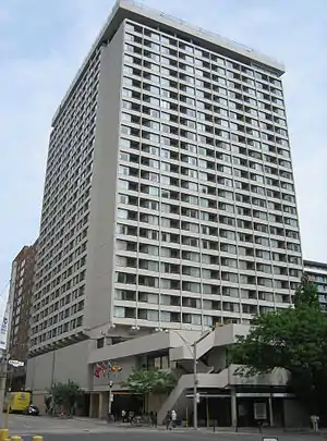 The building was originally constructed as a Motel 11 by the firm Armstrong and Molesworth, a discontinued brand of motels. When it opened in at the Holiday Inn Downtown 1972 it was the fourth largest hotel in the city, with 749 rooms. It cost some $18 million to build and was built on the site of many small buildings of what was then the centre of Toronto's First Chinatown.[1] The hotel was purchased by Hong Kong investor Sally Aw for $73 million in 1989 and renamed the Colony Hotel. The hotel was later partly owned by Aw's listed company Sing Tao Holdings, via Singdeer Joint Ventures. Aw sold Singtao Holdings in 1999. The university purchased the hotel for C$67.6 million in 2003 from Global China Group Holdings (the new owner of ex-Sing Tao Holdings' media business) and other owner of the joint venture,[2] at the height of a downturn in Toronto's hotel industry.