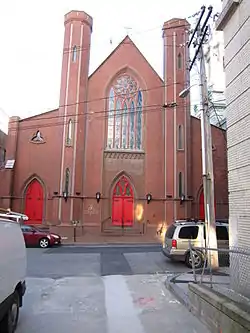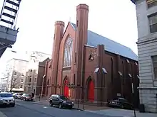 The former Chestnut Street Church building is set in the city center, directly behind Portland City Hall on the east side of Chestnut Street. It is a single story masonry structure, built out of pressed brick with brownstone trim. Its slate roof is steeply pitched at the center, with a gentler slope over the outer aisles of the nave. Its foundation is brick, faced in brownstone to a height of 2 feet (0.61 m). Its walls are buttressed, with Gothic arched windows between the buttresses on the side walls. The main facade is symmetrical, with a pair of equal-height towers flanking the central gable. The towers originally had more elaborate spires, but these were removed for safety reasons in the 1950s, as were similar spires on the buttresses. There are three entrances, one at the center between the towers, and one each on the side aisles, all set in Gothic arched openings.[2]