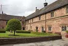 In the early 14th century, the de la Warre family acquired the land through marriage. Thomas de la Warre refounded the church as a collegiate church in 1421.[4] De la Warre gave the site of his manor house for the construction of a college,[5] where eight priests, four clerks and six lay choristers lived in the care of a warden.[6] It is likely that building began between 1424 and 1429,[7] and the main hall and cloister rooms finished by 1458.[8] It remains the most complete building of its kind in the country,[3] and at the time of its construction, was the second largest building in Manchester, surpassed only by the church.[7]