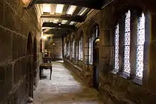 College House, the original 15th-century college, is a Grade I listed building built of sandstone in the shape of a lowercase 'b' with a slate roof. It is accessed by the original gatehouse;[7] which was constructed on a plinth and contains the original timbers. The upper storey is accessed by an external staircase.[73] Baronial Hall, once the Great Hall, contains many of its original features, such as its timber roof, dais and canopy. There is a large fireplace dating from the 19th century,[74] and three windows likely to date from the 16th century.[75] The Audit Room, originally a common room,[76] contains a panelled ceiling with decorations suggesting it was installed by the Stanley family.[77] The upper room, originally the warden's chamber,[76] is now the library reading room, and contains a large bay window within an elaborate Tudor arch,[77] as well as original 17th-century doors.[78] The west part of the building surrounding the cloister courtyard contained accommodation known as sets, for people who lived in college.[79] There were two rooms in each set on two floors, the lower floor being used as a study.[80] Historian Clare Hartwell, describes the cobbled courtyard which has a restored well as "one of the most atmospheric spaces in the building".[79] It is surrounded by many windows, which were probably originally unglazed.[81] Inside there are several corridors and passages containing open beams and original stonework.[80] To the east is the kitchen and associated rooms,[82] and further east are rooms used for administration offices, most of which have been substantially altered.[83]