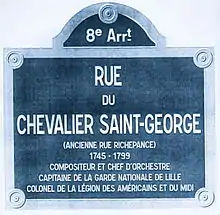 In 1753, his father took Joseph, aged seven, to France for his education, installing him in a boarding school, and returned to his lands on Guadeloupe.[13] Two years later, on August 26, 1755, listed as passengers on the ship L'Aimable Rose, Bologne de Saint-Georges and Negresse Nanon landed in Bordeaux.[14] In Paris, reunited with their son Joseph, they moved into a spacious apartment in the St. Germain neighborhood at 49 rue Saint André des Arts.[15][16]