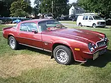 A new Type LT model was offered in 1973, with a quieter and better-appointed interior, full instrumentation, Rally-style wheels, variable-ratio steering, sport mirrors, and hidden windshield wipers, among other upgrades. The Super Sport package was dropped, and the big block 396 cu in (6.5 L) V8 was no longer available. Power was down due to new emissions standards, with the top-rated 350 cu in (5.7 L) V8 producing 245 hp (183 kW; 248 PS) in the Z28.[8] The engine was switched from solid-lifters to hydraulic tappets. Air conditioning became available as an option with this engine. The Z28 option could be ordered on both the sport coupe and LT models. When the Z28 and Type LT options were combined, the usual Z28 badges, stripes, and graphics were deleted.