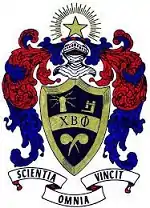Its coat of arms is a shield, draped and showing beveled edges. At upper left, on the shield is an electrode, to symbolize the science of Physics. At upper right is placed a microscope, to symbolize both Biology and Psychology. At the top of the crest is a star to symbolize both Astronomy and Math. The Computer Sciences are alluded to by its surrounding rays. At the lower portion of the crest are two retorts, to symbolize Geology and Chemistry. The letters of the fraternity are placed across the center, and the motto is on the ribbon below.[1]