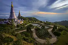 Chiang Mai province is about 685 km (426 mi) from Bangkok in the Mae Ping River basin and is on average at 300 m (1,000 ft) elevation. Surrounded by the mountain ranges of the Thai highlands, it covers an area of approximately 20,107 km2 (8,000 sq mi). The mountains of the Daen Lao Range (ทิวเขาแดนลาว) at the north end of the province, the Thanon Thong Chai Range (เทือกเขาถนนธงชัย) with the highest mountain in Thailand, Doi Inthanon at 2,565 metres (8,415 ft), stretching in a north–south direction, and the Khun Tan Range in the east of the province are covered by rain forest. The Mae Ping, one of the major tributaries of the Chao Phraya River, originates in the Daen Lao mountains. Several national parks are in the province: Doi Inthanon,[4] Doi Suthep-Pui,[5] Ob Luang,[6] Sri Lanna,[7] Huai Nam Dang,[8] Mae Wang,[9] and Pha Daeng.[10] The total forest area is 15,404 km2 (5,948 sq mi) or 69.6 percent of provincial area.[1]