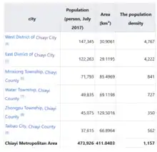 According to the definition of metropolitan areas formerly used by the Republic of China (Taiwan) government,The Chiayi metropolitan area includes the following areas: