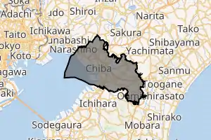 Chiba (千葉市, Chiba-shi, Japanese: [tɕiꜜba]) is the capital city of Chiba Prefecture, Japan. It sits about 40 kilometres (25 mi) east of the centre of Tokyo on Tokyo Bay.[1] The city became a government-designated city in 1992. In June 2019, its population was 979,768, with a population density of 3,605 people per km2. The city has an area of 271.77 square kilometres (104.93 sq mi).