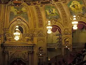 The interior shows French Baroque influence from the Second French Empire.[1] The grand lobby, five stories high and surrounded by gallery promenades at the mezzanine and balcony levels, is influence by the Royal Chapel at Versailles. The grand staircase is patterned from the grand stair of the Paris Opera House and ascends to the various balcony levels.[16] Marshall Field and Company supplied interior decorations including drapes and furniture. The crystal chandeliers and bronze light fixtures fitted with Steuben glass shades were designed and built by Victor Pearlman and Co.