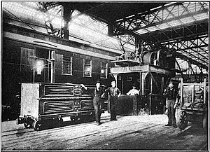 Revenue service in the tunnels officially began on August 15, 1906, with a 2-mile (3.2-kilometer) 16-minute run. By that time, 45 miles (72 kilometers) of track were in place, with connections to four railroads and 40 on-line customers. A total of 67 locomotives and 400 freight cars were on hand.[68] In fact, coal delivery by subway began on October 13, 1905, when several carloads of coal were delivered from the Chicago and Alton Railroad coal chutes.[69]