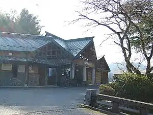 Chikuzen-Iwaya Station (筑前岩屋駅, Chikuzen-Iwaya-eki) is a railway station on the Hitahikosan Line in Tōhō, Fukuoka, Japan, operated by Kyushu Railway Company (JR Kyushu). To the north of the station, the 4380 m Shakadake Tunnel can be clearly seen, where a fatal tunnel collapse occurred during construction in 1953, killing 21 construction workers.