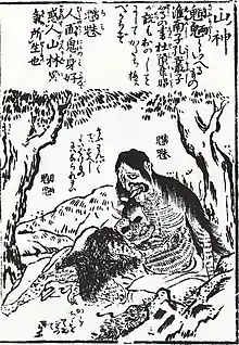 Chimi are said to be monsters that come about from strange atmosphere (miasma) in mountains and forests. Taking on an appearance with the face of a human, and the body of a beast, they would perplex humans. In the dictionary Wamyō Ruijushō from the Heian period, they were considered to be a type of oni under the Japanese name "sudama", and in the Edo period encyclopedia, the Wakan Sansai Zue, they were seen to be mountain gods (Yama-no-Kami).[3]