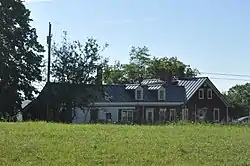 Chimney Farm stands on a peninsula called East Neck, one of two that separate two lobes of Damariscotta Lake. Between the two peninsulas is a cove of the lake; the Chimney Farm property originally extended entirely across East Neck between the eastern lobe of the lake and the cove, but is now reduced to 20 acres (8.1 ha) fronting the lake. The property includes a farmhouse and barn, a small writing cabin, and a small family cemetery that includes the graves of both Henry Beston and Elizabeth Coatsworth. The farmhouse is a rambling 1-1/2 story wood frame structure, with a Cape style main block, a tall ell to the east, and a long single-story ell running north from the north west corner of the main block. The original portion of the house dates to the early 19th century, but has a later 19th-century turret-like projection built above its front door. The west-facing side door is sheltered by an elaborately carved hood, exhibiting floral motifs and intricate carvings of animals.[2]