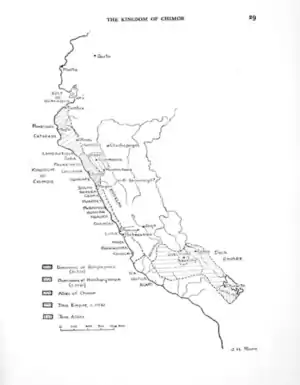 The Chimor-Inca War was a conflict fought in the late 15th century between the Inca Empire and the Chimor Empire of coastal Peru. At the time of the conflict, the Chimor Empire was in a process of territorial expansion, but as the Inca Empire appeared in the picture, it became impossible for the Chimor to consolidate its conquests.[1] Early skirmishes occurred when the Inca Empire conquered the non-Chimor inland city of Cajamarca.[2] The Incas led by Topa Inca Yupanqui responded to hostilities by advancing first north to Quito in modern Ecuador and then turning their attention to the Chimor Empire.[2] The Chimor Empire was likely conquered from the north. Once conquered, the Incas established an indirect rule over the Chimor.[2] To consolidate victory the Incas pressured the Chimor to hand over the unruly Chimor cacique Minchançaman who travelled to Cuzco becoming a "luxury prisoner" while his more collaborative son acceded his position in his homeland.[1]